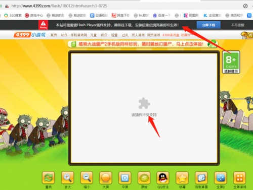 这里的插件指的是Flash Player插件,有些网站顶部也会进行提示。除了小游戏,Flash插件还可以播放视频、上传照片……当浏览器出现插件不受支持的提示,没办法正常浏览网站都可以按照同样的办法进行解决。