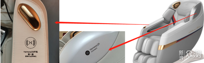 这是一款融入了鸿蒙生态的按摩椅。 在按摩椅的侧边配备了蓝牙模块和NFC模块, 支持HarmonyOS Connect, 只需要搭载鸿蒙系统的手机, 轻轻靠近碰一下这个图标, 就可以跳转到按摩椅的APP控制界面。