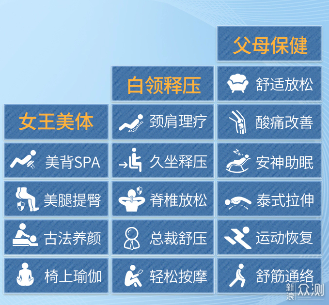 iRest艾力斯特R2S按摩椅还内置了15套按摩程序, 非常有特点的专门为女王, 打工人, 老人定制了不同的按摩放松程序, 非常贴心。 其中女王美体程序模拟了7种仿真人按摩手法,让女王可以在家里边敷面膜边做SPA,放松的舒畅从颈部至大腿根部, 从内至外打造完美体态。