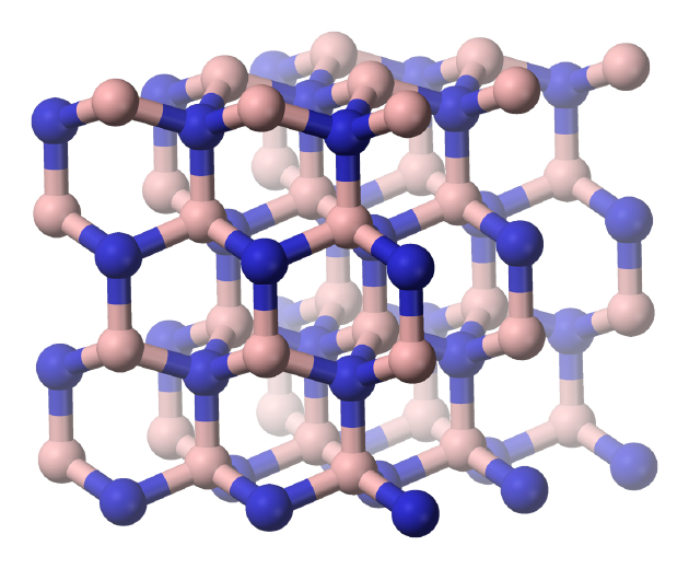 除了碳之外,其它许多原子或化合物也可以构成晶体,氮化硼就是其中之一。硼和氮在元素周期表上分别居于第五和第七位,两种元素组合在一起,可以产生各种各样的可能性,包括非晶形、六方晶系(类似于石墨)、立方体(类似于钻石,不过结构强度稍差一些)、以及纤锌矿型。