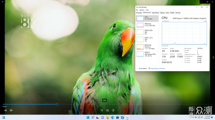 播放一段VP9编码的8K视频时,可以看到完全是GPU在工作,CPU的占用率仅2%。