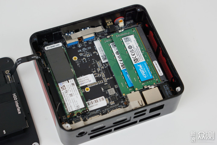 SER4的主板容纳了两个内存条插槽,一个m.2 2280的NVMe固态硬盘插槽,和一个2.5寸的HDD/SSD硬盘插槽。而m.2 2230无线网卡,散热风扇和CPU则是在主板的另一面。无线网卡也是可以拆卸的,不过标配的网卡已经支持最新的WiFi 6E和蓝牙5.2,短期内没有更换的必要。我的这台机器出厂时已经预装了两根16GB的英睿达DDR4-3200MHz内存条,和一个500GB的NVMe固态硬盘。