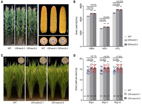 在这项研究中,由中国农业大学的杨小红教授、李建生教授和华中农业大学的严建兵教授领衔的团队,在两种作物中找到了一个影响产量的关键基因。田间试验显示,敲除这个基因后,玉米和水稻的谷物产量分别增加10%和8%,而且对其他农艺性状没有任何明显的负面影响。