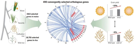 ▲在全基因组范围内,研究人员鉴定出了玉米和水稻经历趋同选择的490对种间同源基因,包括玉米的KRN2及其水稻同源基因OsKRN2(图片来源:参考资料[1])