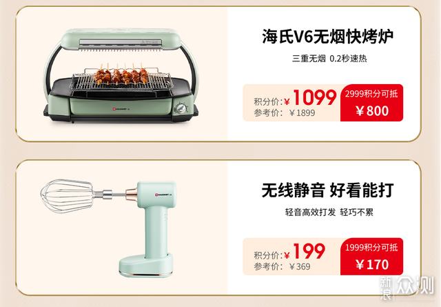整体福利解析:活动期间会送会员专享券和积分,积分有两个作用。一是用积分可抽取100元大额优惠券,二是可秒杀换购用。这次海氏家的烤箱、打蛋器、厨师机、料理机等产品全线参与,参与秒杀的几款比站内历史促销价还低,有需要的网友及时入手。