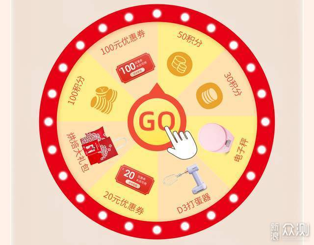 参与方式:转盘抽奖,奖品有“100元优惠券、20元优惠券、电子秤、D3打蛋器、烘焙大礼包、100积分、50积分、30积分”。