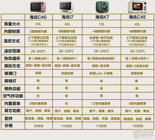 首先通过我整理的这张参数对比图,可以看出海氏家即便入门级的C40烤箱,在温控方面也配备了2个进口感温探头+PID电子芯片,最核心的温度精准度有保证,这就大大提高了新手的烘焙成功率。