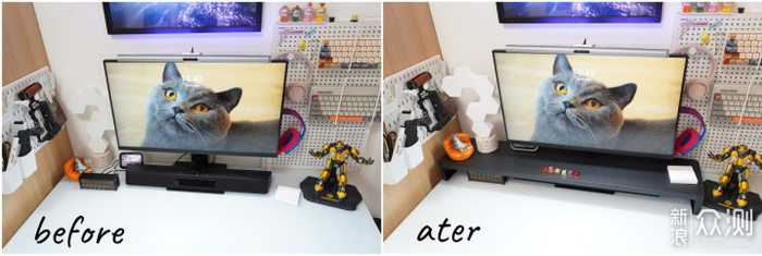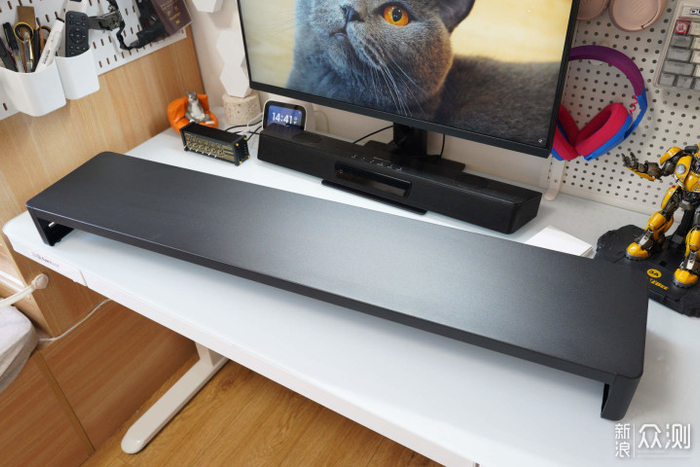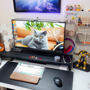 因为桌面本身可以调节高度,因此我并没有把显示器放在增高架上,而是用它遮盖之前杂乱的桌面,装上增高架之后,桌面的立体感明显强了很多,也没有那么凌乱了,之前评测过的创新KATANA V2音箱刚好可以放置在支架下面,我选的这个支架是总裁版的基础款,长度为985mm比较适合1.2m的书桌,至于那些USB接口和无线充功能,价格会贵上不少,我觉得压根没有必要,对了买之前一定记得去小黄鱼搜搜看,有他家官方店铺,价格有惊喜。