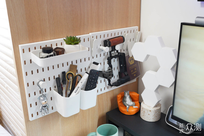 左侧的柜子这边有点空荡荡的于是又在PDD上买了两块洞洞板,这个洞洞板是塑料材质的,质感比起之前那块金属的差了很多,不过好在我不打算往上挂一些很重的东西,主要是收纳文具以及一些杂物,所以承重型还是够的,如果你打算挂掌机、耳机等比较重的外设那么就不是很推荐了,我这个板子的尺寸是28×28cm,需要的话还可以继续往上叠加,上面的配件也不贵,小盒子大概五六块钱一个,挂钩是一块多一个,选购的时候要注意孔径,以免买回来不能适配。