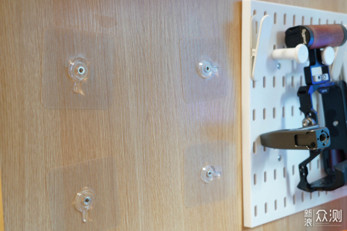 背面是这种无痕胶固定 ,拧上螺丝之后稳如老狗,倒是洞洞板本身的质量以较一般,挂的东西太多整个板子会变弯,很难贴紧墙面,装饰性的东西只要不打孔安装我都是双手表示赞同,因为很多东西总有一天会看腻,厌倦的时候把它换掉,这样就能永远保持新鲜感。
