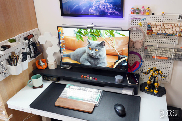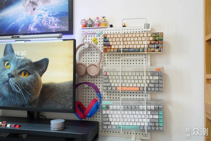 合理的收纳 是桌面整洁的关键,我之前有个铁质的洞洞板,使用宜家那个洞洞板支架架在桌子上还是很稳定的,后来索性被我用来收纳键盘和耳机了,除了收纳之外还能起到墙面装饰效果,而且不用在墙上打孔我还是挺满意的。