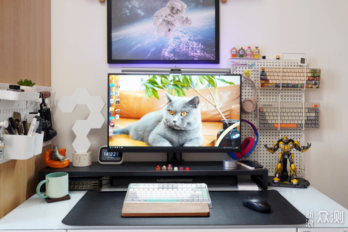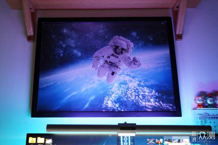 显示器的上方挂了一张宇航员的装饰画 ,yeelight的RGB灯一打,还挺有感觉,不是每个男孩都有一个航天员的梦想,我们女孩也从小就梦想着有朝一日能够探索星辰大海。喜欢在墙面挂东西的同学我强烈推荐你们这个3M的魔力扣,简直打破了我对传统双面胶的偏见,结实耐用,拆卸的时候还不损坏墙面,除了小贵之外,完美。