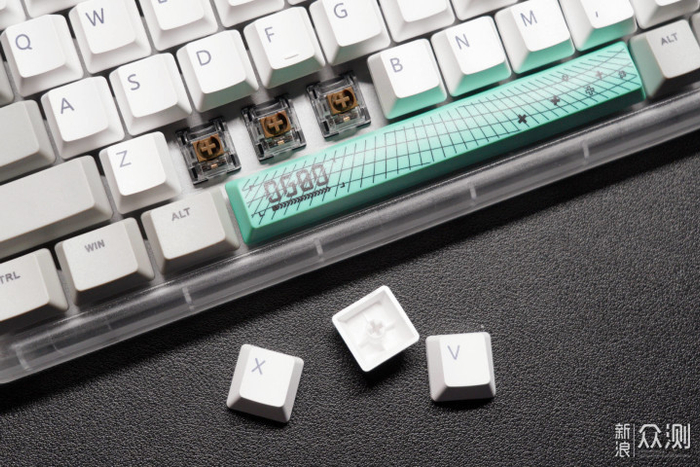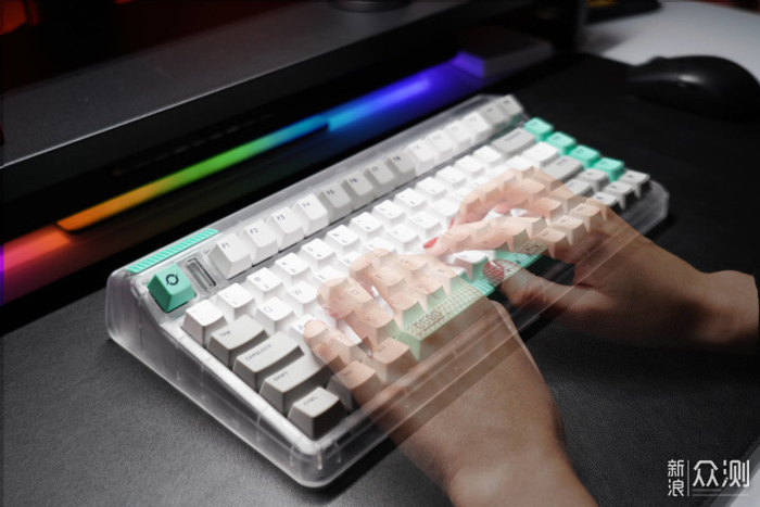 原厂键帽以牛油果绿、浅灰、白为主色调,搭配磨砂透明的外壳,给人一种特别小清新的感觉。F区的阶梯式结构算是铝厂一个很经典的设计,除了很有辨识度之外,打字的时候减小了手指敲击按键的跨度 ,长时间码字对手腕比较友好,按键布局是现在比较流行的83键位,右侧多出的一列功能键区在实际使用的时候还是很方便的,办公游戏都能兼顾的到。