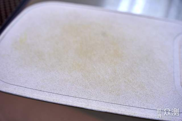 小麦秸秆菜板确切地说是谷纤维菜板,秸秆、麸皮材质安全放心,高温压制成型的菜板轻薄小巧,缺点也很明显——不耐用、易打滑。小麦秸秆菜板具有可降解性,所以使用半年之后,菜板已经有了肉眼可见的损耗,板面染色也无法去除。加上本就单薄的小身板,切菜时都不敢使大力。这款菜板是用来处理果蔬的,板面表面光滑,吸水率更低,导致切个流汁的番茄、西瓜时容易滑动。