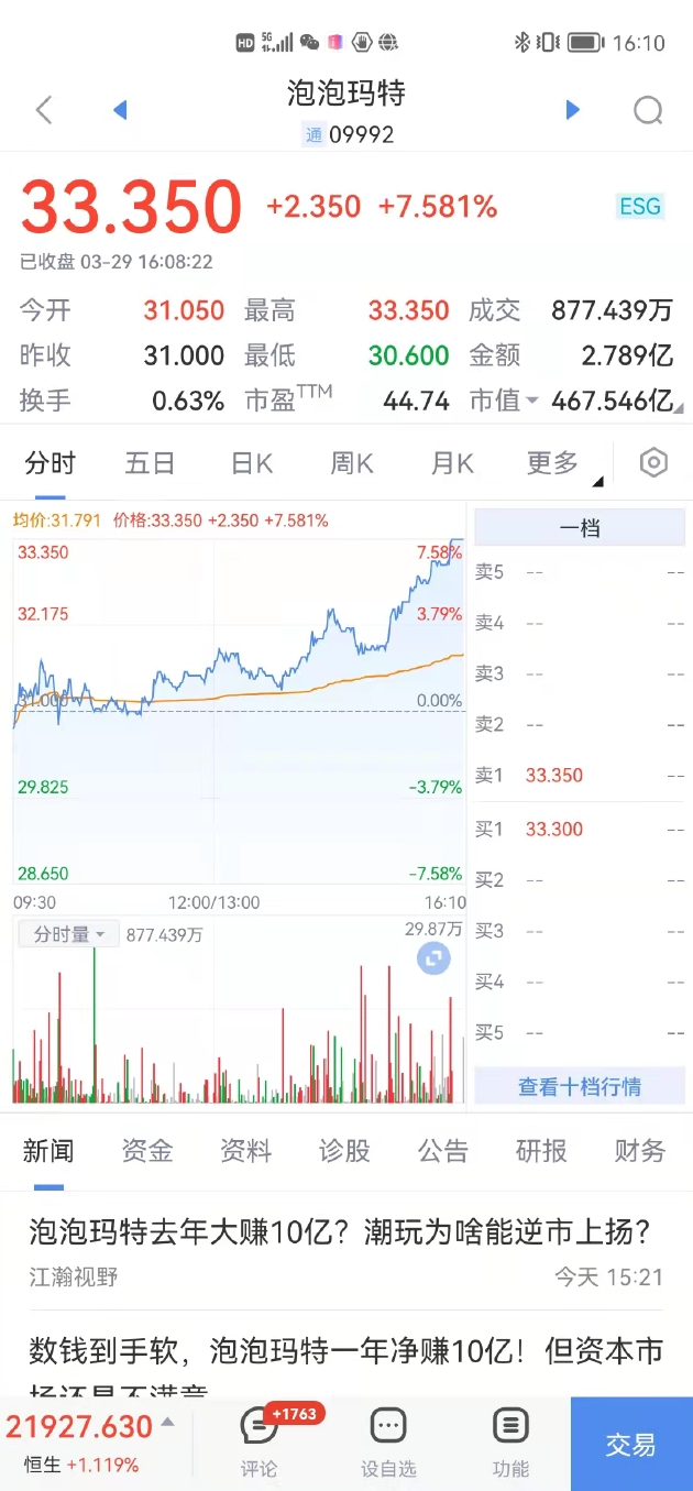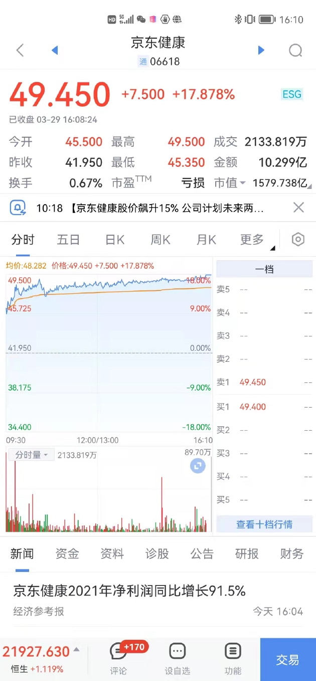 新浪科技讯 3月29日下午消息,香港恒生指数收涨1.12%,恒生科技指数收涨2.52%。京东健康收涨近18%,拟回购最多价值30亿港元公司股份。泡泡玛特涨超7%。