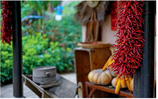 为什么传入很晚的辣椒反而成了我国农村最常见的悬挂植物呢?首先离不开中国五行风水文化,红色在五行属火,在五方属南,而中国传统民居的门户大多坐北朝南,因而在门口悬挂辣椒也符合五行方位这一解释。当然还有更直接和简单的原因,即民间对于气味强烈的香辛料最初用于驱虫,而后衍生出辟邪文化,古时的菖蒲、艾草、山茱萸等皆如此。辣椒传入中国的时间虽然较晚,但它鲜明的特征又完全符合香辛料传统,被视为有辟邪之用也是理所当然。而且由于干辣椒易于保存,不易腐坏,悬挂时间比过去的艾草、柳条都长很多,故而给人留下的印象也最为深刻。