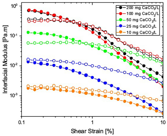 当碳酸钙浓度较高(100和200 mg/L)时,较低的剪切应力振幅(0.5%)就能让茶膜碎裂,即G″ > G′。然而,当碳酸钙浓度降低到50 mg/L时,则需要更高的应力振幅(0.8%)才能让茶膜裂开,因此以储能为主(G′ > G″)的茶膜更有韧性而不易碎。但对于10和25 mg/L而言,无论应力怎么变化,损耗模量一直大于弹性模量,此时的茶膜就像流体一样,难以成型。