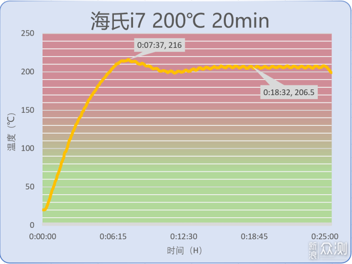 长帝大白鲸有更快的加热速度,前段曲线斜率更高,但可能因为温控因素,曲线有拐点,实际达到预热提示时间为7分钟,后半段加热波动较大,上下控制点温差在10℃以上,可以认为平均205℃。海氏i7的前段曲线与长帝大白鲸一致,在平稳阶段维持在了206℃的位置,稍微偏高了,但曲线十分平稳,应该是校调问题。海氏C45有更科学的温度曲线,设置200℃预热到了210℃,为开门放食材预留了空间,继续加热温度先降低再缓慢升温,最后温度几乎是直线段的控制200℃±2℃内,非常不错的温控能力。