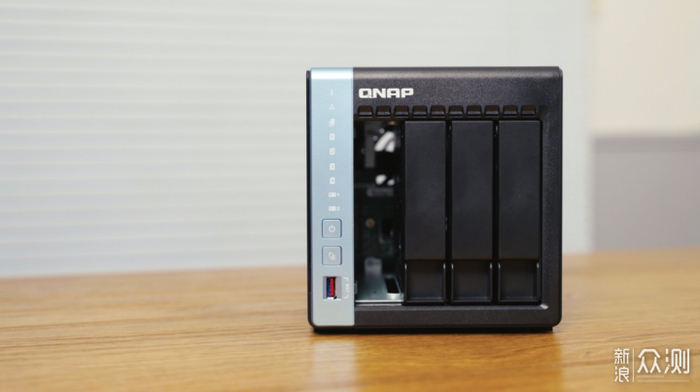 整体来看,威联通TS-464C采用传统的NAS形态。正面右侧四盘位,支持热插拔,装卸方便。