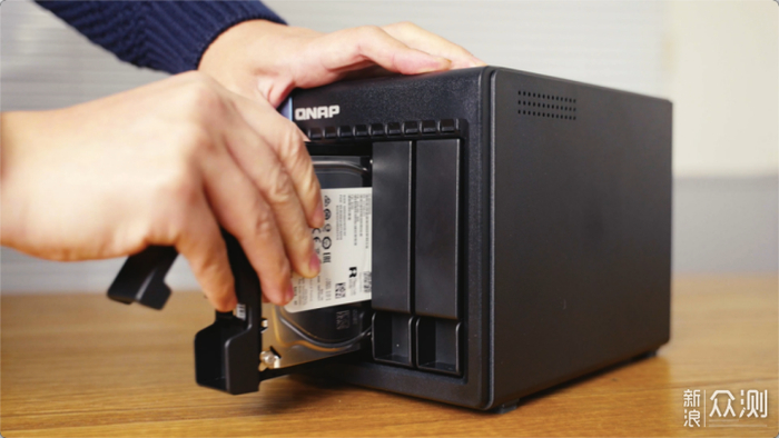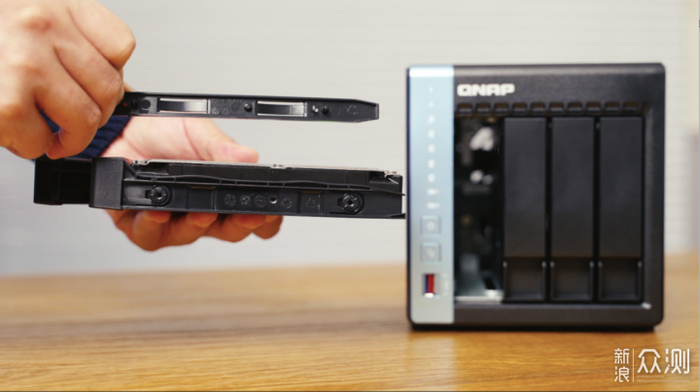 安装其实很简单,威联通的硬盘托架可以免工具直接安装。将四块硬盘分别装入托架,插入TS-464C中。