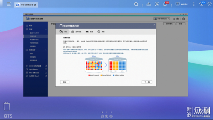 点开之后,选择新存储池,会有一个是否启用Qiter的选项。Qiter是威联通的优势功能之一,可以根据你使用文件的频率,自动选择将文件存放在NAS的固态雷克沙NM620还是机械硬盘希捷酷狼中。并且当你完成此项目,使用频率下降之后自动转移至机械盘中,让常用数据读写都更快。