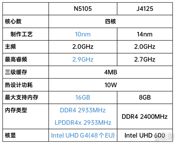 我们看到与前作TS-453Dmini采用的CPU:J4125的对比。可以看到TS-464C采用的 N5105,在制程、睿频频率、最大 支持的内存大小及规格方面都占优。