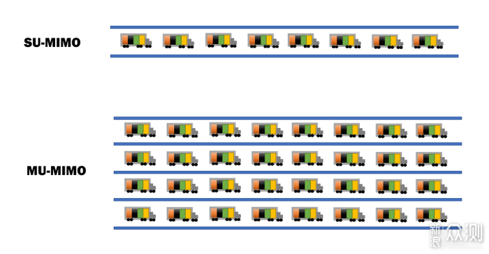 那这个时候假设货物的数量,超过了一辆车的装载,数据就会分多辆车装载,而在SU-MIMO的时代,但在同一时间和同一个频段内,路由器只能够与一个客户端设备通信,这就等于只有一个高速出口的高速公路,大量的货车要按顺序通过出口。而这时候MU-MIMO技术就出现了,MU-MIMO技术能够为不同的用户选择空闲的信道进行传输,让每一个用户都能高速连接,而且会各自走各自的车道,不会堵在一起,从而使大量的数据也能够同时传输,进一步提升快速网络体验以及保证很低的延时,此外4*4MU-MIMO是要更优于2*2MU-MIMO的哦,建议还是选择前者会更加好一些。