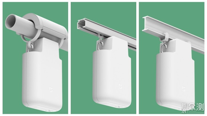 而米家的电动窗帘伴侣完全换了一种工作模式,以窗帘杆为导轨,以自身的滚轮作为转动驱动,产品上的挂钩直接勾在窗帘上,然后产品收紧挂钩与窗帘杆的位置直至滚轮与窗帘杆接触,以此实现自动开启窗帘。关键是,它还适应了国内最常见的三种窗帘杆!
