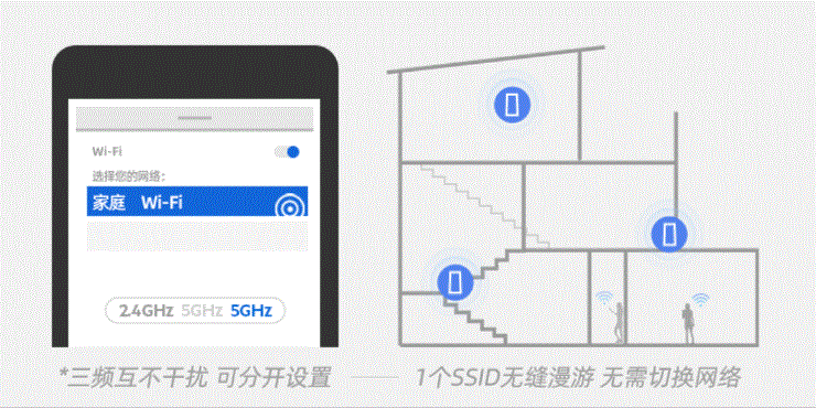 假设家里如上图有2个WiFi信号点,一个WiFi1在客厅,一个在主卧WiFi2,当我们连接了客厅的WiFi1然后回到房间后,WiFi1的信号虽然比较弱,但还是跟手机保持连接状态的,我们需要手动在WiFi设置里面选择主卧的WiFi2。那打游戏、在线看剧、视频通话等一切网络在线的功能都会为此中断。