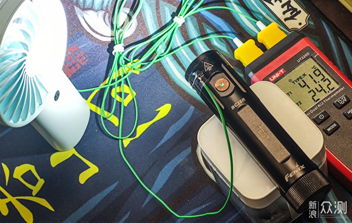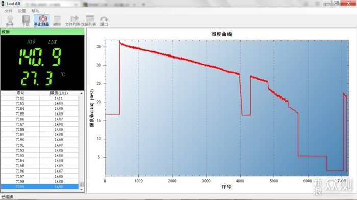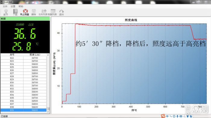 使用照度计连接电脑画图做客观测试,灯头距离照度计大约0.5米,同时连接热电偶测温,开启风扇模拟户外骑行效果。