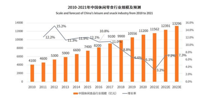 随着消费水平的提高,休闲零食其实有十分广阔的前景。iiMedia Research(艾媒咨询)数据显示,从2010年到2021年中国休闲食品行业市场规模从4100亿元持续增长至11562亿元,预计2022年增速达7.2%,市场规模达12391亿元。