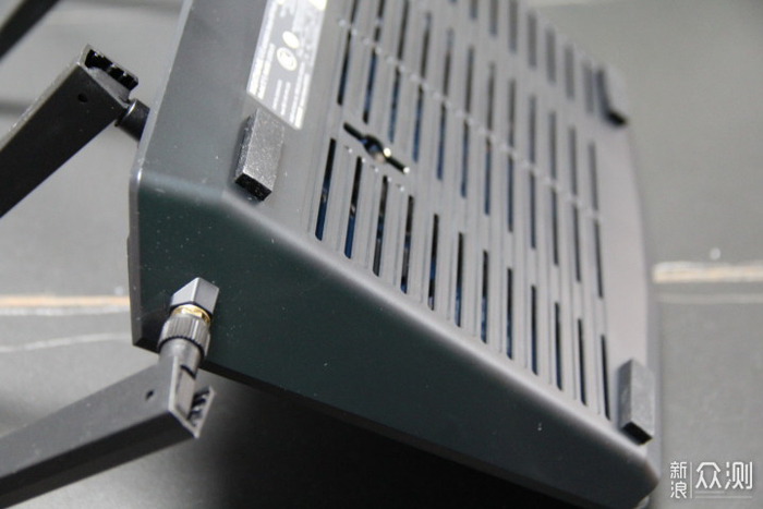 底部同样有大面积的散热格栅,同时也支持壁挂摆放,细心的朋友可能观察到了,网件RAX50这款路由器的胶皮脚垫比一般路由器要高一些,这样可以提供更好的导热条件,细节到位,好评。