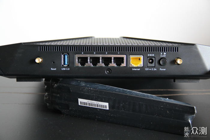 背面接口,从左至右分别为USB3.0、四个千兆LAN、一个千兆WAN,5.5mm电源接口和独立电源开关。上盖后方的散热格栅直通到了接口上方,有点像影视剧里的大背头发型。