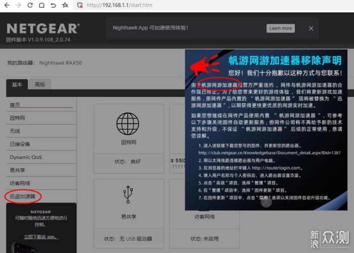 设置完之后系统初始界面会弹出个公告,我一开始没仔细看,说网友加速器移除了巴拉巴拉,但是系统里明明还有啊,没办法又重新弄出来给大家截图,才发现移除的是帆游,目前内置的是迅游。