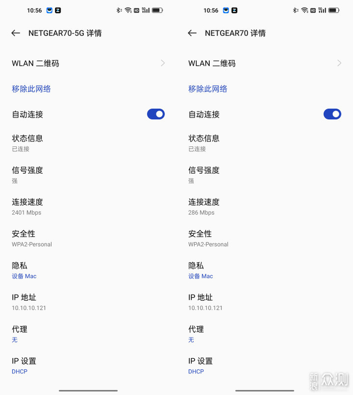 用测试手机一加10 Pro分别连接网件RAX50的5G和2.4G信号,此时可以看到手机能握手的最高速率分别为2400Mbps和286Mbps。在厂商的不懈努力之下,现在的路由器5G穿墙能力已经不弱于2.4G,就算不如2.4G穿墙厉害,5G剩下10%也有240Mbps,而2.4G剩下50%也不过140Mbps,显然还是5G快。所以以后我不测试2.4G信号了,感觉2.4G信号就是给部分老旧设备留着的。