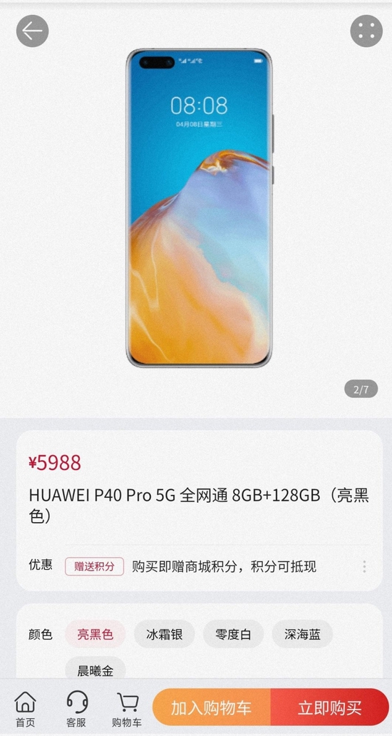 华为商城重新上架了华为 P40 Pro 8GB+128GB 版本,提供亮黑、冰霜银、零度白、深海蓝、晨曦金五款配色,目前官方售价 5988 元,与当初发布相同。