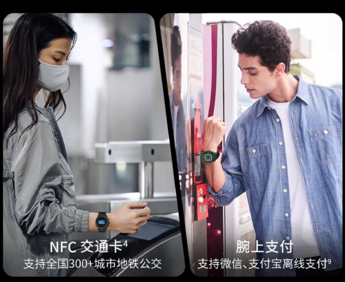 与兼容智能手机配对,可以智享全天候互联带来的便利生活,新增NFC功能,可绑定北京互通卡,支持全国300+城市地铁公交轮船的支付,抬腕即可进站,便捷出行。另外还具有支付宝和微信支付功能 ,设置快捷方式一键触达,腕上轻松付款。