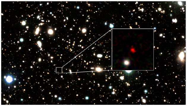 研究团队使用阿塔卡马大型毫米/亚毫米阵列(ALMA)进行了后续观测以确认距离,该距离比目前最远星系的纪录保持者GN-z11还要远1亿光年。