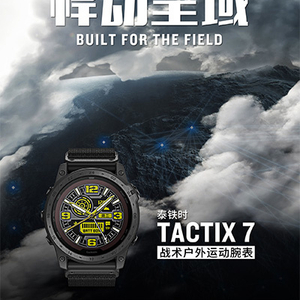 据介绍,泰铁时 tactix 7 系列以军规标准 (MIL-STD-810) 打造,10ATM 防水标准。全新金属按键及护肩外加金属表耳,黑色 DLC 镀膜钛合金表圈及后壳,标配 QuickFit 尼龙编织表带,是一款坚固耐用的多功能智能手表。Tactix 7 搭载了 1.4 英寸结合太阳能充电技术的防刮擦合成蓝宝石屏幕。
