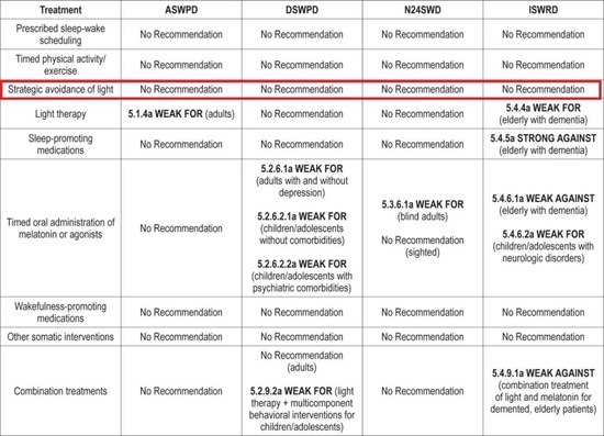 在美国睡眠医学会发布的临床实践指南中,不推荐采用针对性地避免某些光照的做法来进行治疗节律障碍(红框处)。(原图来源:Auger et al。, 2015。 https://doi.org/10.5664/jcsm.5100)