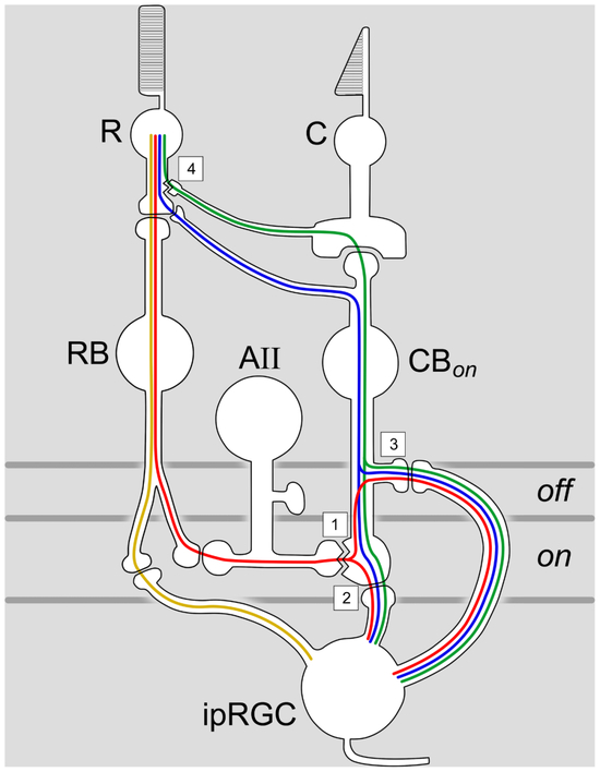 视网膜内ipRGCs、视锥细胞和视杆细胞相互联系(见下文)的示意图。R为视杆细胞,C为视锥细胞。(图片来源:Weng et al。, 2013。 https://doi.org/10.1371/journal.pone.0066480)