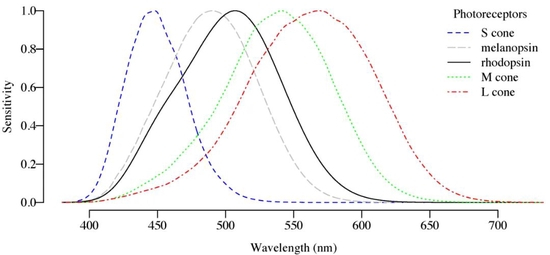 几种感光色素对不同波长光的灵敏度曲线。(图片来源:Conus et al。, 2020。 https://doi.org/10.3390/photonics7040121)