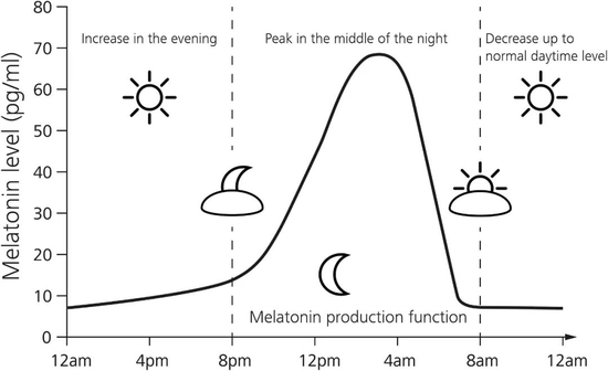 提到蓝光的危害,就不得不介绍常常和睡眠问题同框出镜的另一大明星——褪黑素(melatonin)。褪黑素是脑部松果体分泌的一种激素,可以调控昼夜节律。光照会抑制褪黑素分泌,这一过程受到了视交叉上核的调控。在自然状态下,日落后不久我们体内褪黑素的分泌就开始增加,在凌晨2点-4点时达到峰值,随后便逐渐降低,每天都会呈现出这样的周期性变化。体内褪黑素含量的周期变化也常常作为反映昼夜节律的指标。