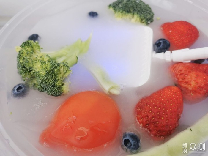 东菱DL-1271开启后放置于果蔬中间,可以看到清洗仓中产生了丰富细腻的泡沫,与果蔬进行充分接触,清除果蔬中的脏污、并分解表面上的残留农药。东菱DL-1271默认清洗时长为10分钟。