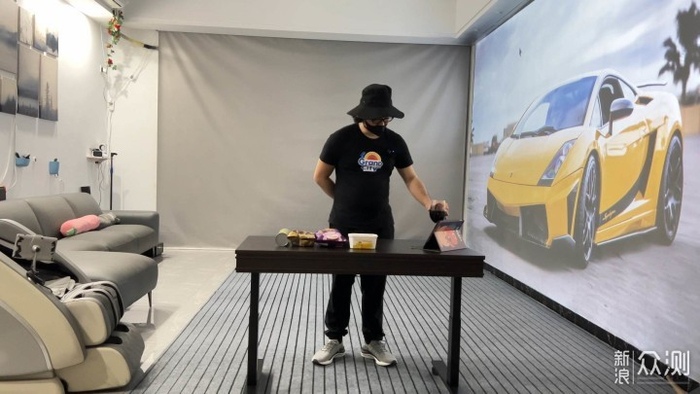 而且我最喜欢的就是,因为我经常要测各种投影机,放这个桌子可以调节高度,轮子可以移动,非常的方便我去调节画面的大小。