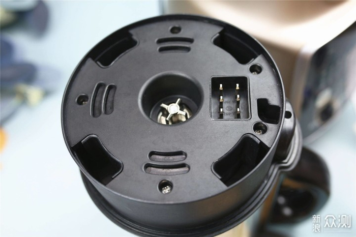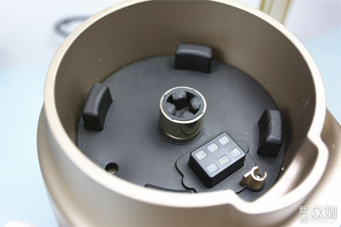 从上面来看搅拌杯底座,底座接口部分中间是塑料材质,外部采用金属加固,且可以承载高速旋转产生的扭力。苏泊尔SP815S配备的高速电机,能够强劲高效地进行破壁操作,保证破壁细腻,使打出来的食物口感更加顺滑。