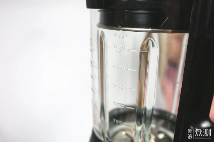 搅拌杯主体采用的是加厚高硼硅玻璃材质,杯体比较厚实,耐磨不刮花,测量厚度6mm(0.238in),1.75l容量,杯壁上有数字刻度,主要刻度有750ml、1000ml、1250ml、1500ml、1750ml,方便操作。