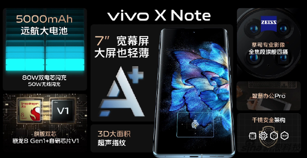 从配置上看,显然已经是旗舰水准。不过因为有了这块7英寸屏幕,X Note成了目前市场不多见的“大屏幕旗舰”——在很早之前,“平板手机”的概念曾经也火爆过,之后热潮消退。vivo将这个概念重新拿出来,也算是跟目前主流的6.7寸屏旗舰做了一点差异化。也是X Fold的补充。