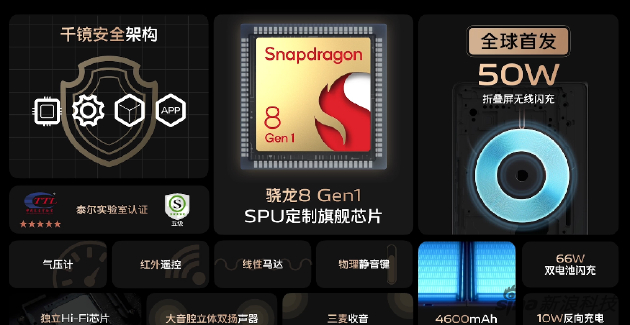 配置方面,vivo X Fold搭载骁龙8 Gen 1 SPU+UFS3.1+LPDDR5的组合。所谓SPU,指的是骁龙8内置的安全处理单元,可进一步提升安全性。基于这颗芯片,vivo打造了“千镜安全架构”,提升安全隐私保护能力。超频版内存和增强版运存能一步提升读写、运行速度。新机还支持内存融合2.0技术,可将12GB运存扩展成等效16GB使用。