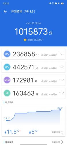 从结果来看,vivo X Note的安兔兔跑分为1015873分,是当前安卓阵营妥妥的顶级水准。
